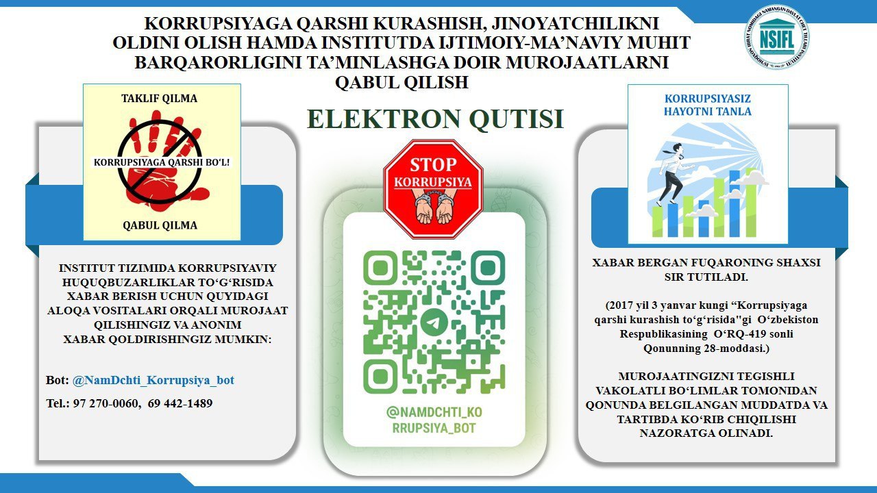 Agarda sizda korrupsion holatlarga oid savollar, muammoli vaziyatlar yuzaga kelsa institutning Korrupsiyaga qarshi kurashish va Komlaens nazorat tizimini boshqarish bo‘limi boshlig‘i Alisher Ikramov bilan quyidagi havola orqali bog'lanishingiz mumkin.